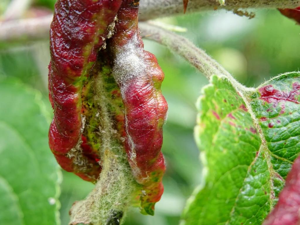 - Личинки активно высасывают соки из нераспустившихся листиках яблони, затем перебираются на цветоножки бутонов. При высасывании соков медяницы оставляют капельки шаровидной формы (отсюда и их название). Эти выделения склеивают листики, почки и бутоны. На пораженных местах начинается развитие грибков.