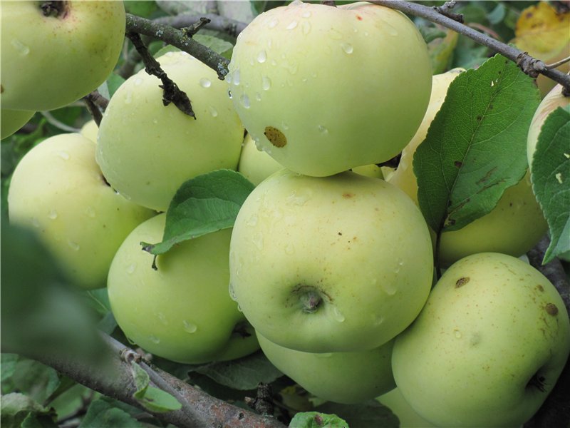 Фрукты яблок,плоды «китайки» небольшие,даже мелкие,плодов навязывается много,ранняя завязь яблок. При полном вызревании и созревании начинают наливаться,это у них от скрещиваемых опылителей и пыльцы.Плоды белого налива достигают средней величины (на привитых яблонях размеры бывают больше). На первой стадии созревания имеют насыщенный кисло-сладкий вкус. Со временем становятся сладкими, рассыпчатыми. Перезревшие яблоки приобретают мучнистый нейтральный привкус. Кожица очень тонкая, легко прокусывается, на спелых яблоках становится практически прозрачной.