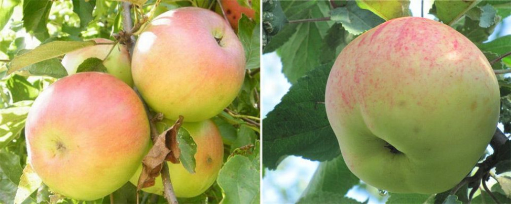 Каждый плод весит более 150 г. Кожура яблок гладкая и имеет светло-зеленый цвет. Почти вся поверхность яблока покрыта красным румянцем в виде штрихов.