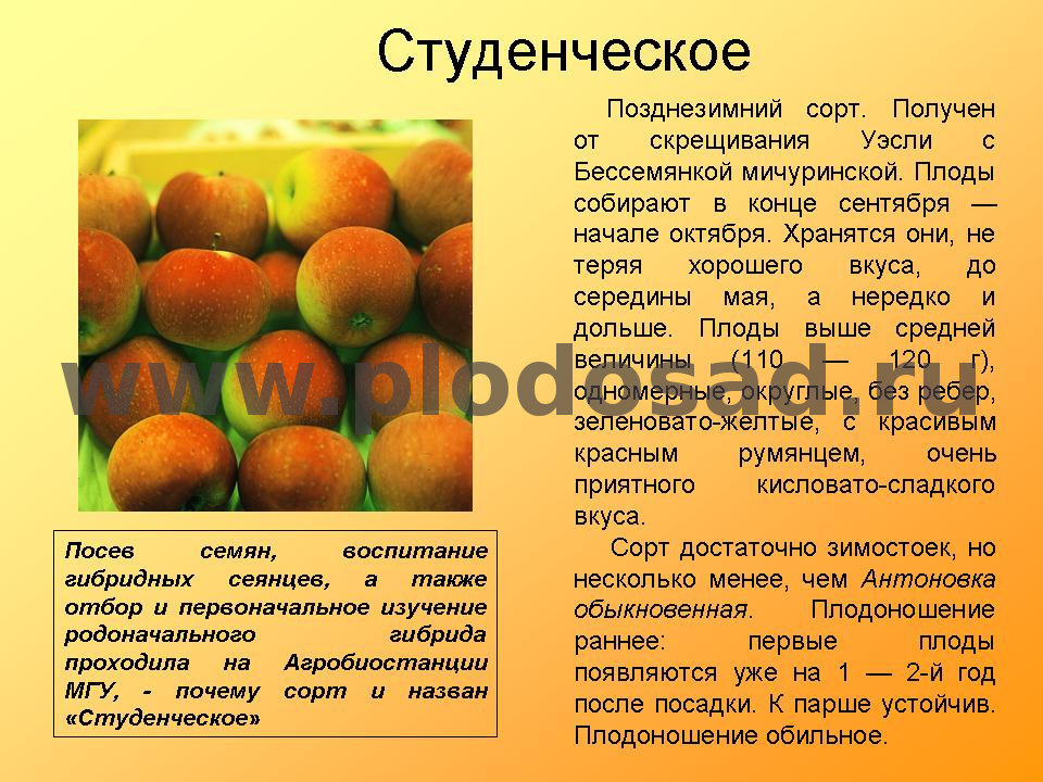 - продуктивность очень хорошая. Урожайность возрастает год от года. Так, 7 – 8-летние деревья приносят по 12 – 25 кг плодов, к 10 – 13 годам эта цифра составляет уже 38 – 60 кг с одного дерева. По данным ВНИИСПК урожайность составляет 102 – 120 кг с дерева;