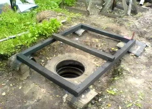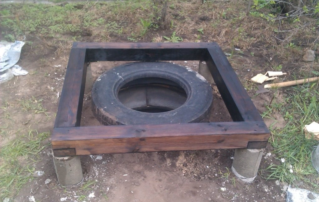 Шины укладывают друг на друга пирамидой. Зазор между кольцами и земляными стенками котлована трамбуют щебнем или мелким камнем с песком. На ободе верхней покрышки вырезают окошко под вытяжную трубу.