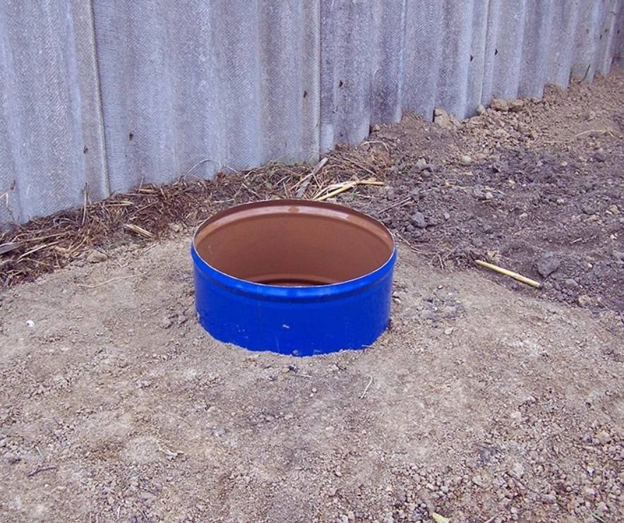 Устанавливаем в нашу яму бочку. Засыпаем всевозможный хламом вокруг.
