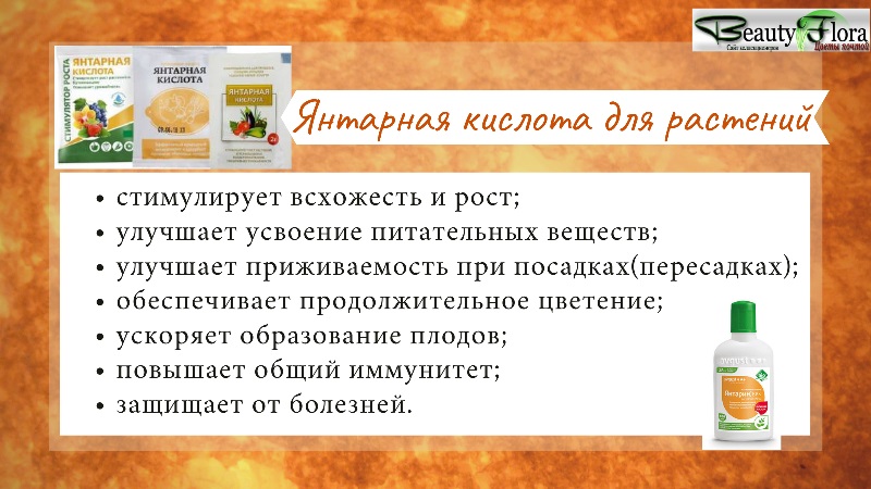 «Янтарная кислота стимулирует рост и ускоряет развитие растений, на 1 литр берём 1 таблетку янтарной кислоты, разводим и замачиваем на ночь или на сутки, а затем просушиваем перед посадкой.