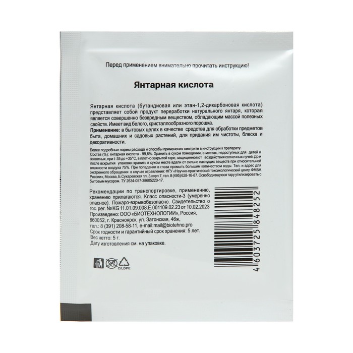 Меры предосторожности: При работе с янтарной кислотой нужно использовать перчатки. При попадании раствора на кожу следует обильно промыть её раствором пищевой соды, а затем чистой водой.