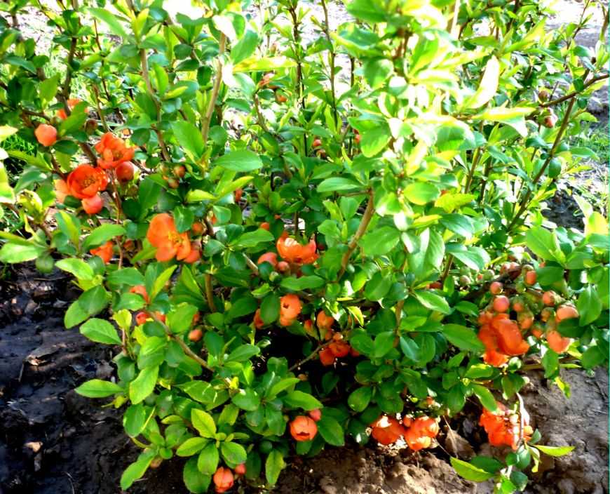 Данный вид еще называют «айвой низкой». Максимальная высота этого колючего листопадного кустарника может достигать 1,5 м. Молодые листья имеют красновато-бронзовую окраску, а затем становятся зелеными. Яркие, оранжево-красные цветки обильно распускаются весной большими бутонами.