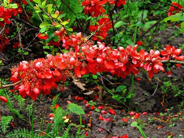 Этот декоративный кустарник с колючими побегами, вырастающий до 3 м, обладает интересным свойством листвы менять свою окраску. Изначально зеленые, со временем переливаются красным, а осенью становятся фиолетовыми. Цветение можно наблюдать около трех недель в майский период. Цветки довольно крупные, алые, красиво покрывают ветки. Выведено множество сортов этого вида, отличающихся простыми и махровыми цветками разной окраски.