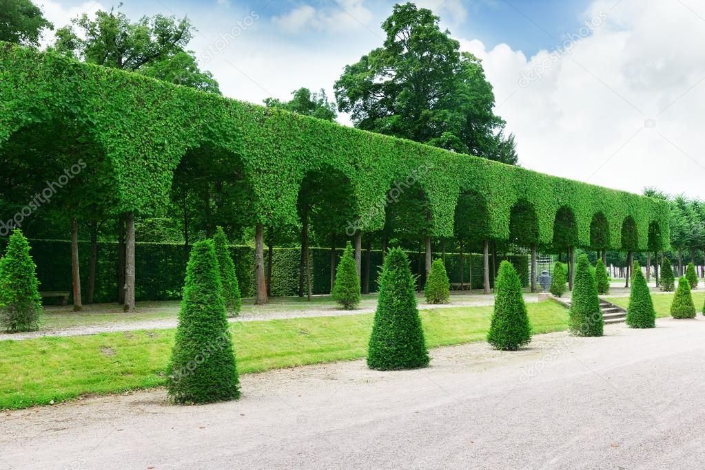 Живому забору из кустарников можно придать любую форму: эллиптическую, округлую, пирамидальную и прочую посредством стрижки.