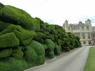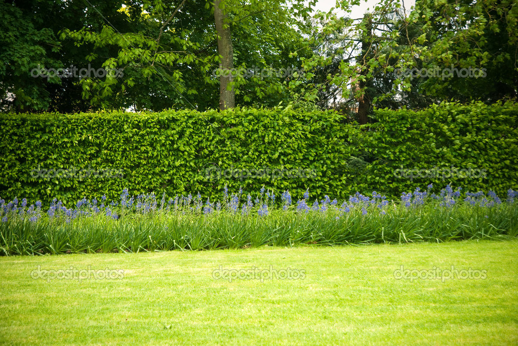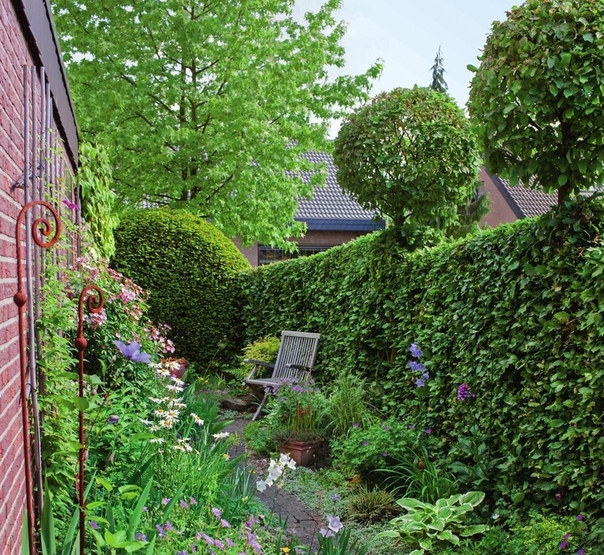 Ниже мы видим пышный сад, заполненный ухоженными вечнозелеными деревьями и кустарниками. Обратите внимание на туи, вырастающие за самшитом. [из Land Architects ]