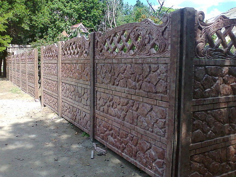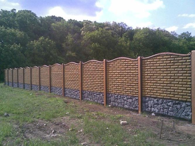Еще один удобный тип конструкции, который был изобретен сравнительно недавно. Изготовление изгороди происходит из классического набора компонентов: столбов, плит, отделочных составляющих. Декор выполнен в виде рисунков с древесной или металлической текстурой. При этом ассортимент расцветок крайне разнообразен.