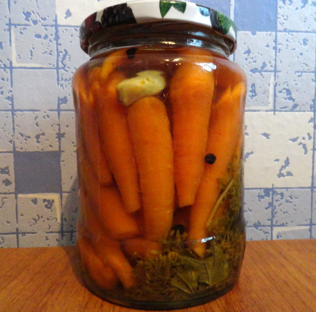 Подготовьте морковь: промойте, удалите повреждённые места, если это необходимо, очистите и нарежьте на кружочки. Бланшируйте морковь в подсоленной воде (20 г соли на 1 л воды) в течение 5 минут. Затем заполните ею банки и залейте горячей заливкой, которая готовится так: в эмалированной кастрюле растворите сахар и соль, доведите до кипения, затем добавьте уксус, вновь доведите до кипения и снимите с огня. Заполненные банки стерилизуйте 20 минут, затем закатайте. Используйте вашу заготовку как гарнир к мясным блюдам и для приготовления салатов.