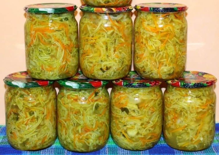 Приготовление: Нарежь морковь мелкими брусочками и протуши с ложкой масла. Произвольно нарежь кабачки, добавь специи, зелень, чеснок, уксус, масло и морковь, и перемешай. Оставь салат на столе на 3 часа и закатай в банки.
