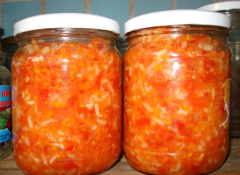 Налейте в кастрюлю или таз масло и выложите овощную заготовку. Протушите овощи, помешивая, на небольшом огне 15-20 минут.