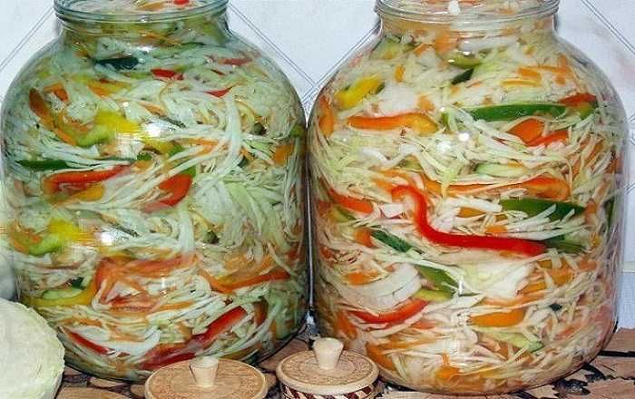 Раскладывайте салат по банкам до верха, легонько утрамбовывая, закупорьте крышками и переверните. Накройте пледом и оставьте медленно остывать на 10 часов.