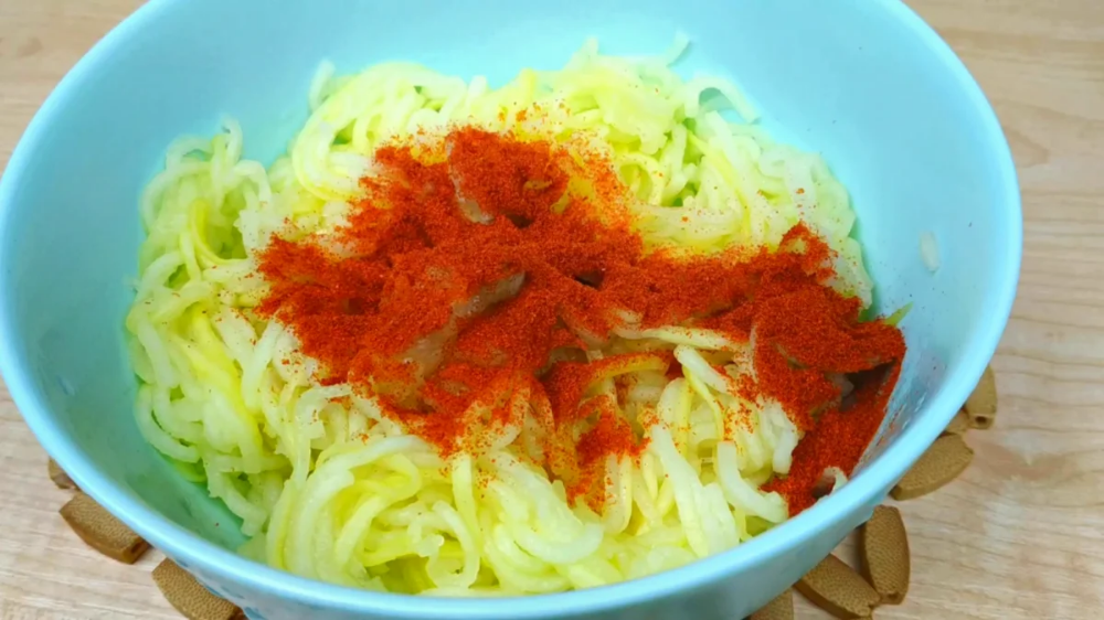 Засыпьте овощи солью с сахаром, добавьте мелко порубленный острый перец чили и аккуратно тщательно перемешайте.