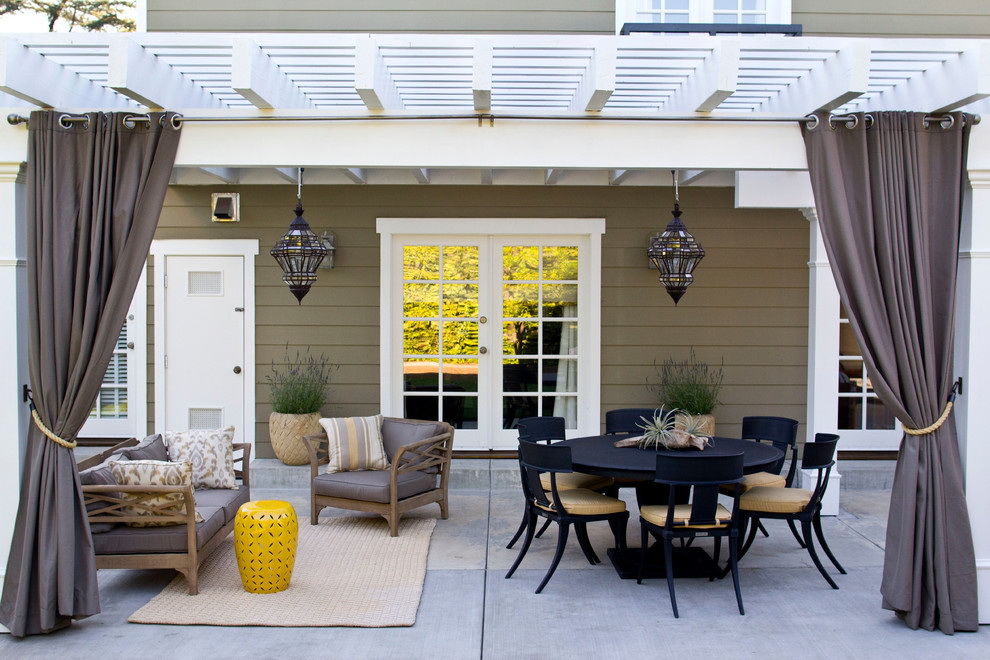На террасе лучше всего смотрятся как гладкие, так и шторы с изысканной структурой. Тип ткани, которую вы выберете, зависит от мебели, установленной в вашем патио.