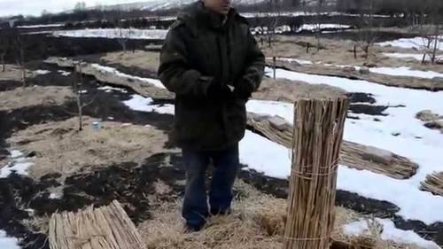 Самым простым, но не менее надёжным вариантом станет обмотка обычными еловыми ветками. Лапник пропускает воздух, но сама процедура довольно хлопотная. Иголки должны обязательно торчать вниз, особенно внизу ствола. Чтобы нижняя часть дерева была надёжно защищена, землю следует плотнее подгрести к еловым веткам.