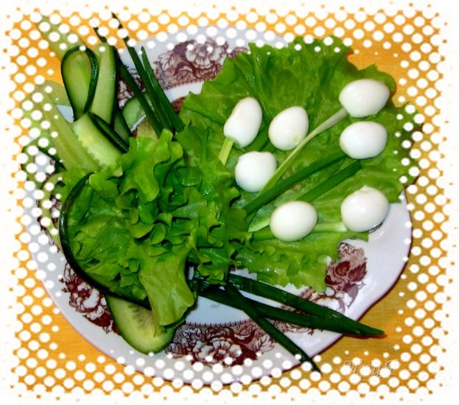 Обложенные стереотипами, мы не хотим искать чего-то нового, а оно есть даже в оформлении блюд зеленью. Это шнитт-лук, который давно пользуется хорошей славой у профессиональных кулинаров. Эти тонкие зеленые трубочки — очень удобная вещь для сочетания с любым блюдом. Особенно любят его подкладывать к канапе или другим подобным бутербродам — он придает им более изысканный вид. Дома его использовать очень просто, тем более, что никаких особых приемов здесь не требуется. Шнитт-лук просто нарезается кусочками и произвольно выкладывается сверху на любые блюда. А уж в детских фантазиях его использовать можно наиболее удачно — лучших усов еще никто не придумал, если родители хотят из каши выложить мордочку кота или тигра. Кроме всего прочего, этот лук очень вкусный.