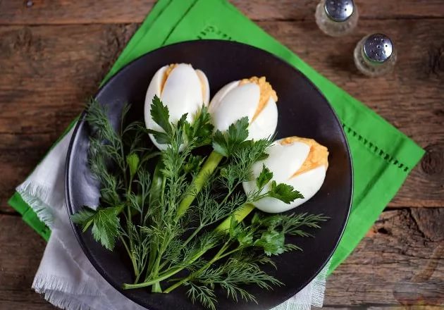 Даже привычные лук и петрушка могут стать действующими лицами в деле наполнения эстетических качеств блюда, если умело ими воспользоваться. Если не хотите постоянно измельчать зелень, попробуйте разделить укроп нам мелкие веточки и посыпьте ими большую тарелку. Получилась основа для многих блюд: сюда можно выложить просто половинки яиц, политых майонезом, песочные корзиночки с салатом, фаршированные помидоры и многое другое. Уже этого хватит, чтобы придать блюду особый шарм. А если добавить еще дольки лимона или яблока — получится целый натюрморт.