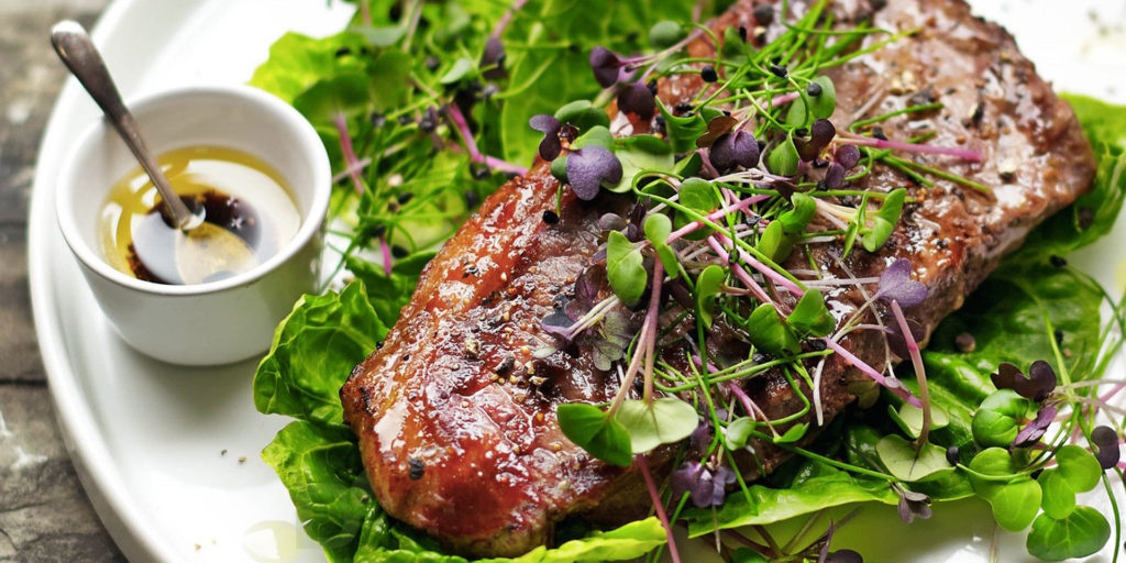 Положите нарезанное мясо поверх полоски бальзамического соуса. Украсьте микрозеленью Fresh Origins MicroGreens и гелем сверху. Украсить точками полевого меда и бальзамическим соусом.