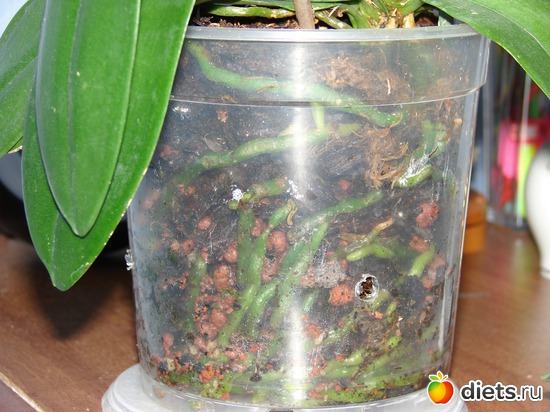 Чтобы корешки были нормального оттенка, цветок пересаживают в емкость с прозрачными стенками.