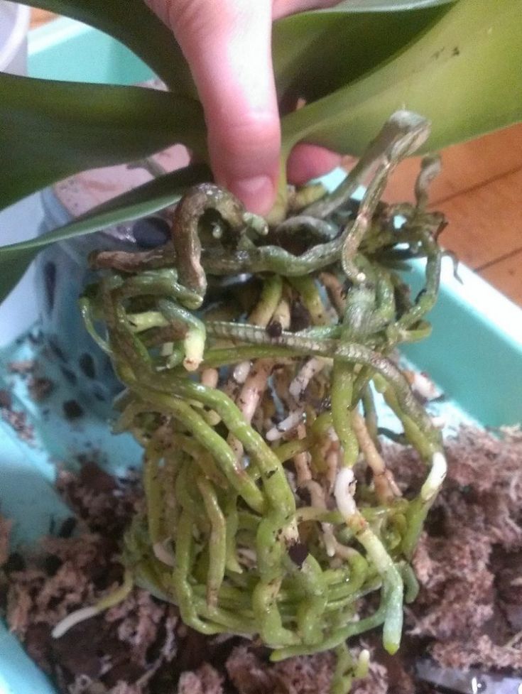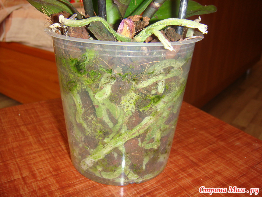 Если их немного, можно оставить все, как есть. Но если большая часть корней покрыта зеленым наростом, то цветок извлекают из коры и промывают корни в теплой воде, очищая их водорослей.