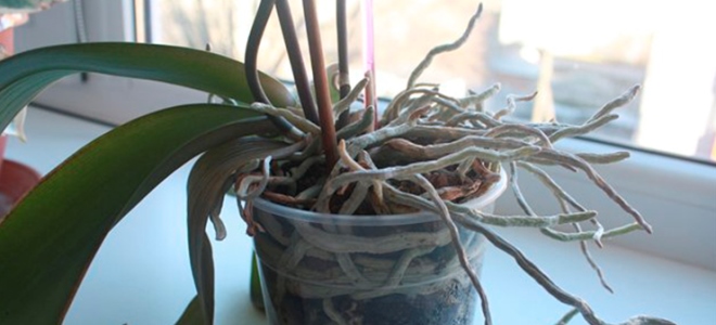 Светло-серый цвет корней говорит о том, что орхидею пора поливать.