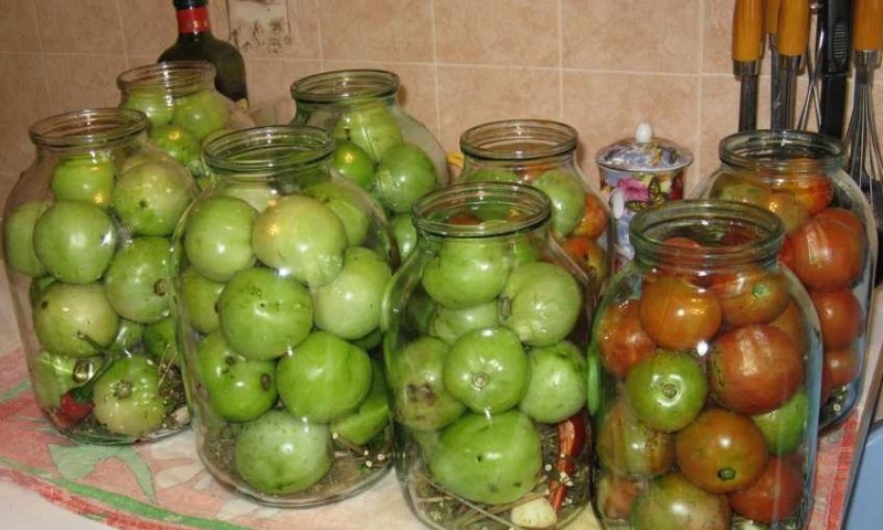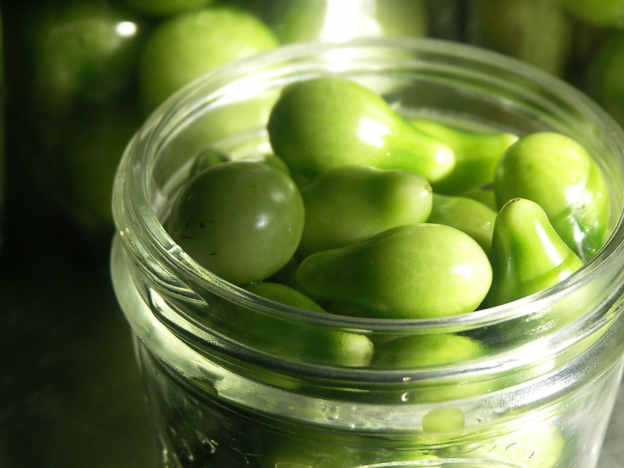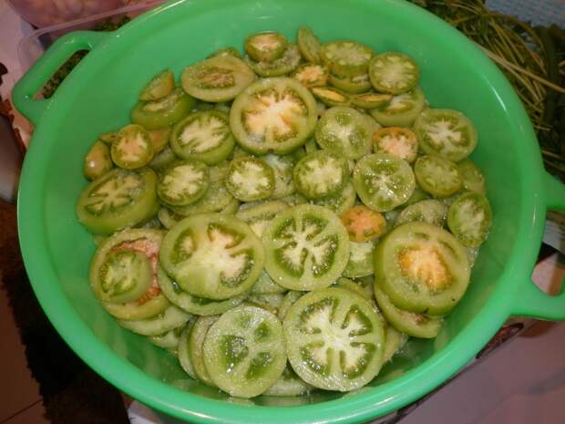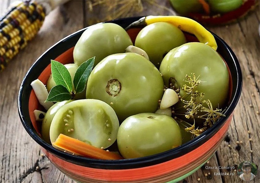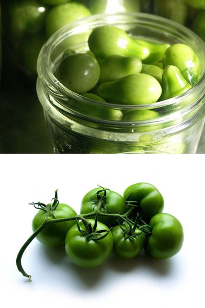 Зеленые помидоры, так как они твердые, хорошо держатся в рассоле уксуса.