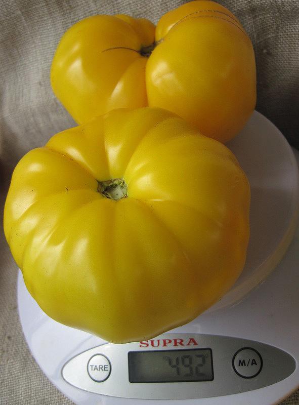 В открытом грунте кусты вырастают до 1,2 м, при тепличном выращивании – гораздо выше. Кисть образуется из 4-6 томатов. С каждого растения можно получить до 8 кг помидоров отличного качества. Поспевшие плоды приобретают насыщенный янтарный оттенок. Мякоть сочная и мясистая, с малым содержанием семян. Масса томатов в среднем может быть от 300 до 600 г, максимальный размер плодов приближается к 1 килограмму.