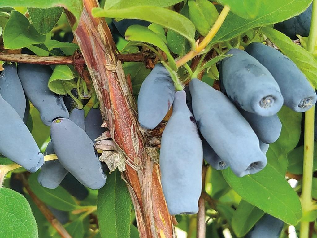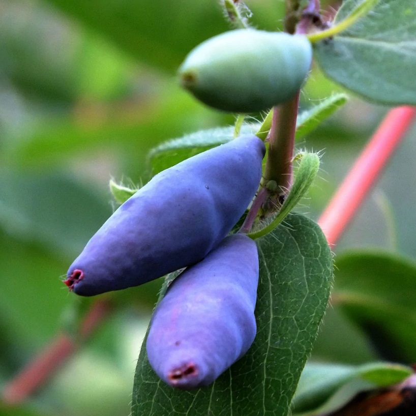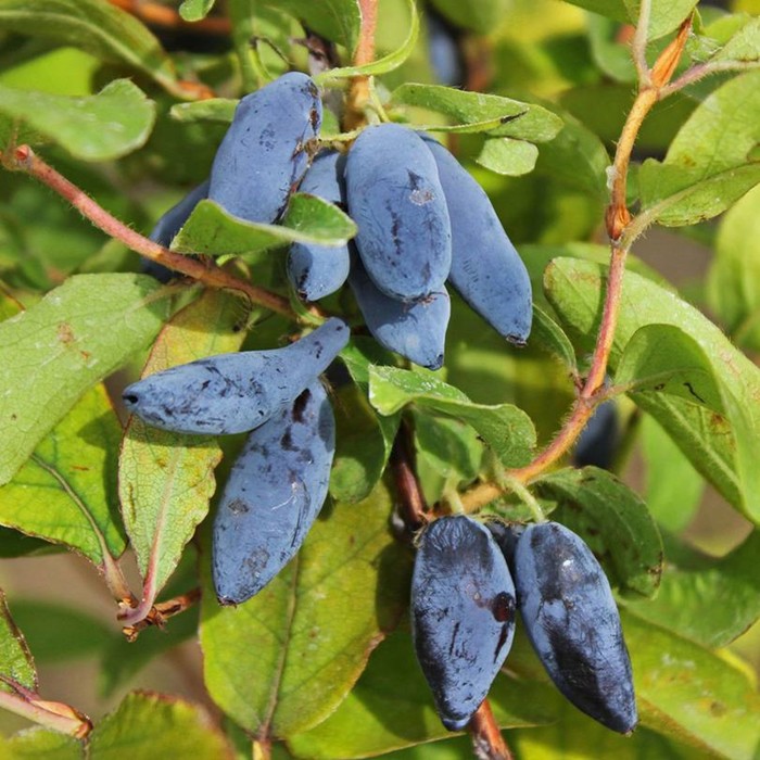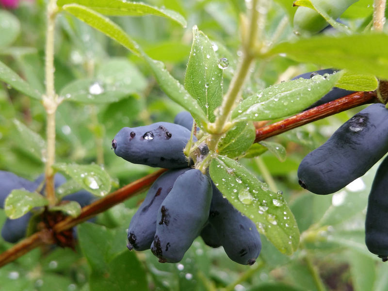 Уже в конце мая можно попробовать темно-фиолетовые, покрытые восковым налетом ароматные ягоды жимолости. По форме ягоды разнообразны — от округлых до вытянутых, с бугристой поверхностью.