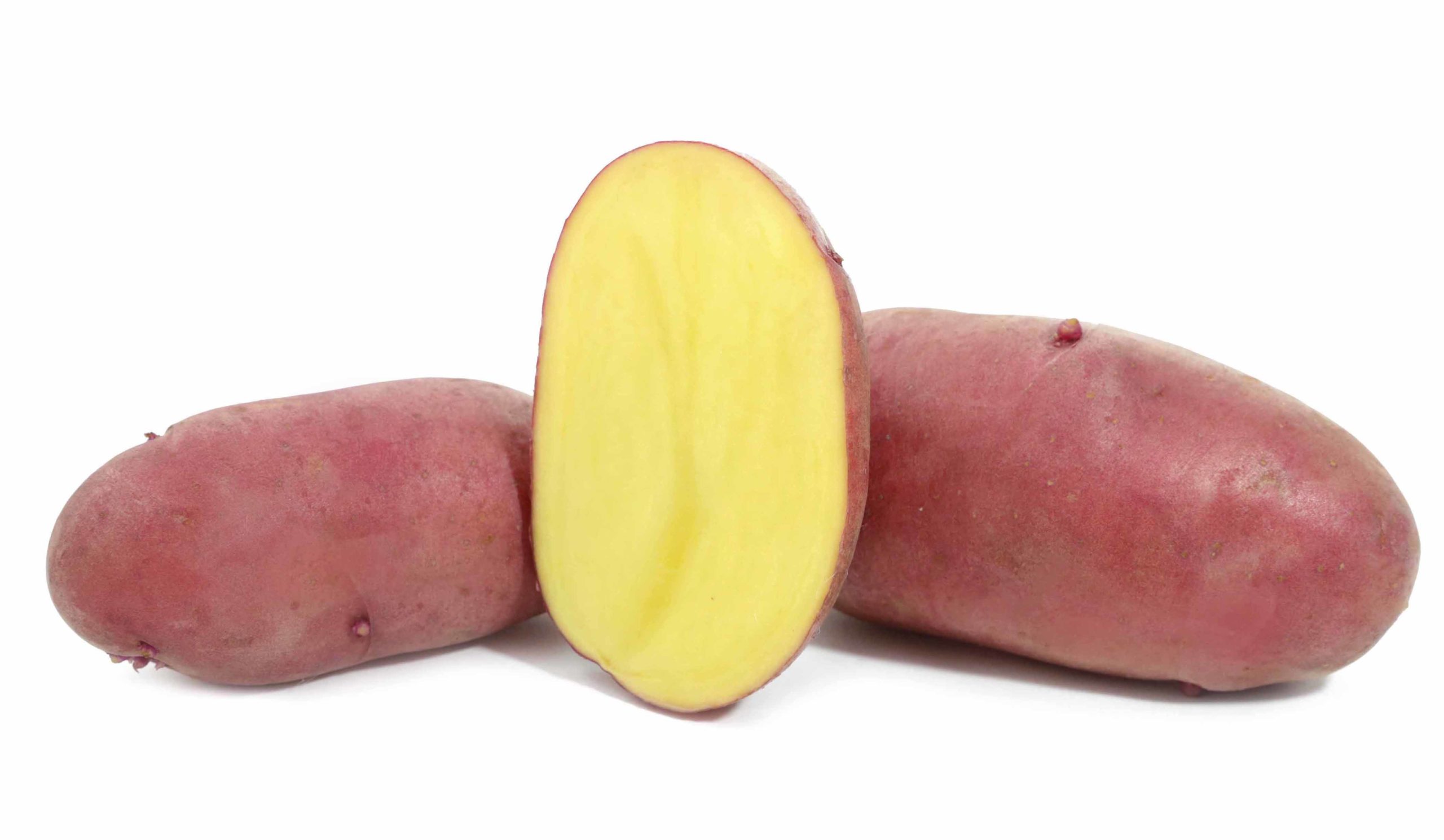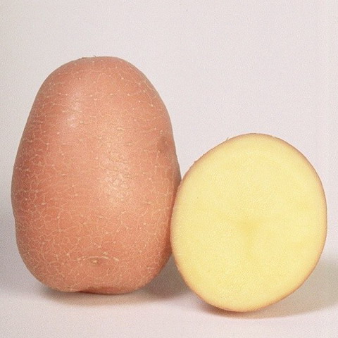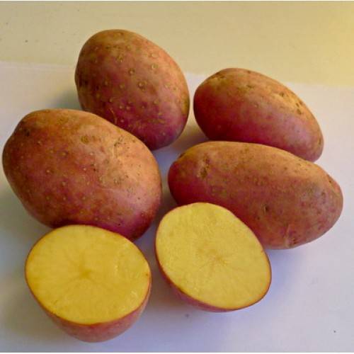 Клубни округлоовальные, среднего размера, со светло-желтой мякотью. Кожура красная, гладкая (слегка шероховатая). Глазки мелкие. Количество клубней в гнезде — до 25 штук.