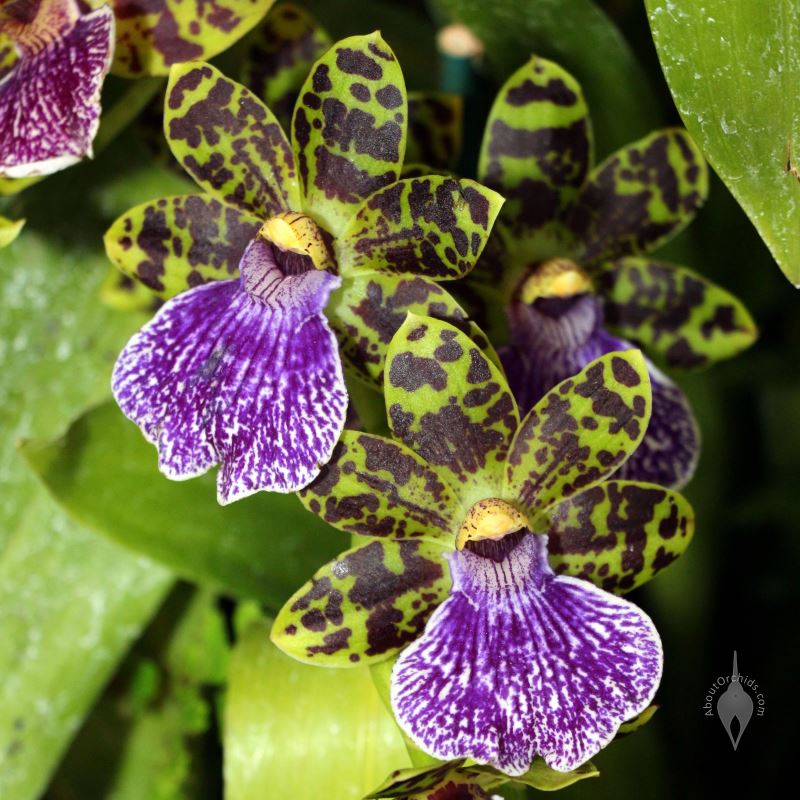 - Zygopetalum intermedium: Желто-зеленые лепестки с пурпурными пятнами и белой пятнистой губой. Орхидея посылает цветочные шипы от 8 до 12 дюймов.