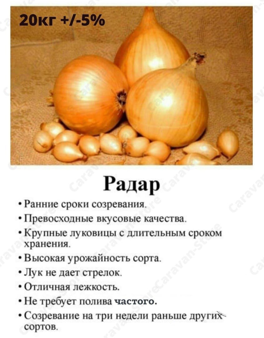 - Радар F1 — гибрид, выведенный голландскими селекционерами. Имеет средний срок созревания. Лук способен выдерживать до -23 °С мороза под снегом, а без снега — до -15 °С. Луковицы больших размеров (до 150 г, а при правильной агротехнике возможна масса и 300 г), устойчивы ко многим болезням и вредителям. Чешуя луковиц имеет светло-желтый оттенок, довольно плотная, что позволяет хранить их длительное время. Отличается Радар F1 хорошей урожайностью.