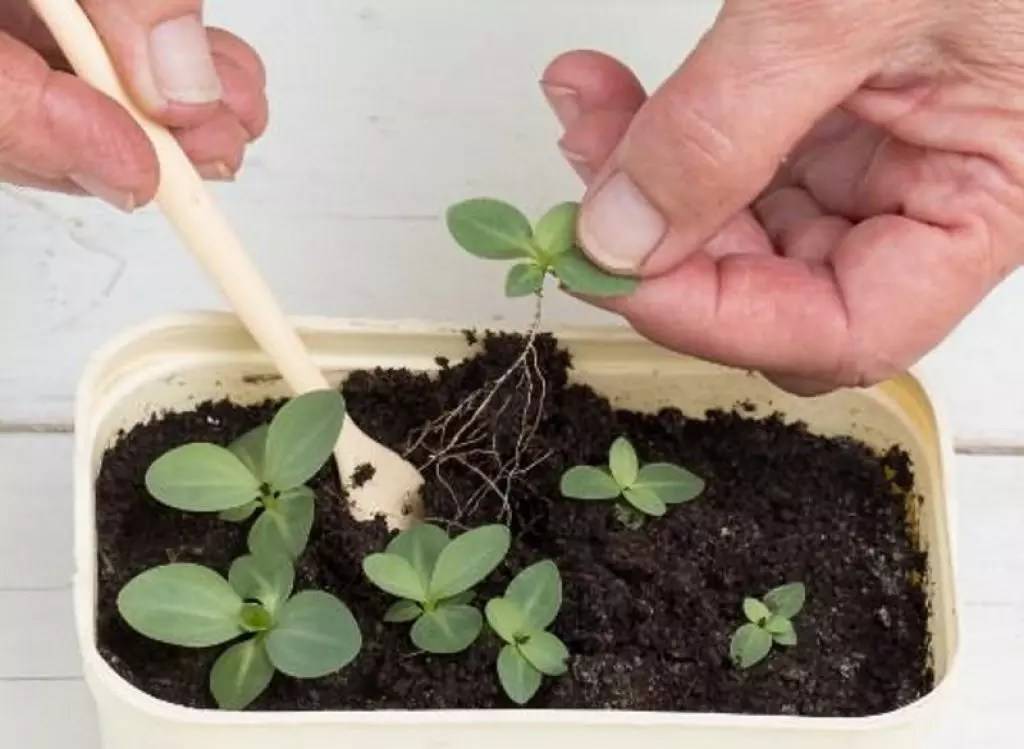 несов., перех. с.-х. Произвести (производить) пересадку всходов растений обычно при помощи колышка с целью улучшения условий для их роста.