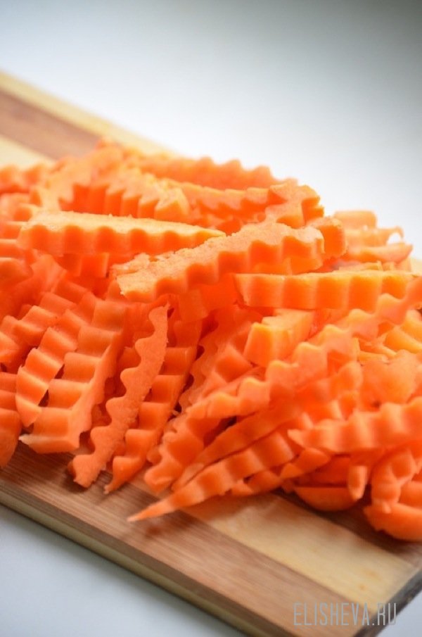 - Когда весь морковный брус будет иметь рифленую форму, начинаем поперек шинковать морковку тонкими ломтиками.