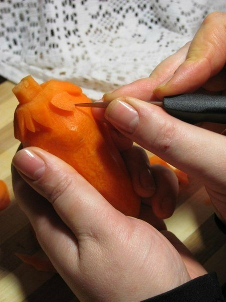 - Теперь, отступив от насечки на небольшое расстояние, начинаем карбовать морковь дугой к насечке, чтобы получился закругленный срез, как на фото. Затем делаем еще один такой же срез, но в другую сторону.