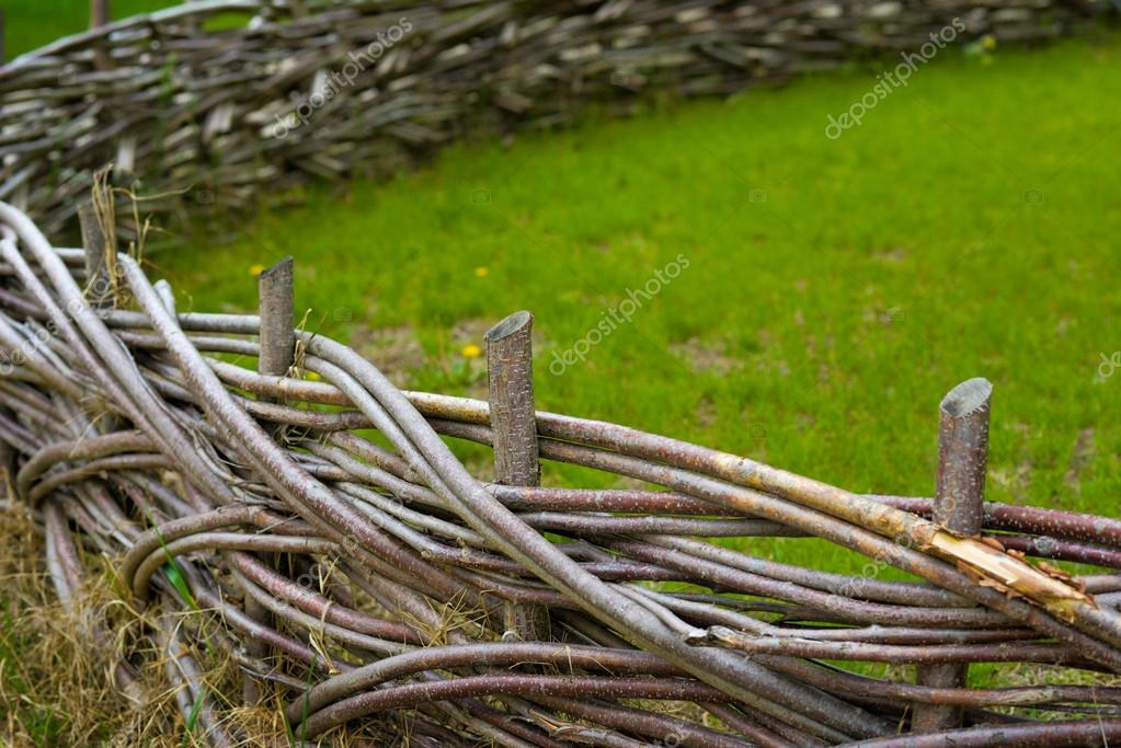 Плетеный забор используют как для огораживания всего участка, так и для выделения зон внутри него. В качестве материала используется лоза, ивовые ветви, орешник, камыш. Выбирают длинные и гибкие ветви и переплетают их, располагая параллельно друг другу. В качестве опоры и поперечной основы используют тонкие столбики, вкопанные в землю перпендикулярно ей.